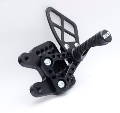 Lábtartóink széles körű és nagyon pontos állítási lehetőségekkel rendelkeznek, hogy minden pilóta be tudja állítani magának a tökéletes pozíciót. Tervezéséből fakadóan könnyű felszerelni. Felülete fekete szinterezett, fehér R&G grafikákkal a lábtartón és a pedál-részeken. A lábtartók speciális kiképzést kaptak, aminek köszönhetően kivételes tapadást adnak a csizmának még a legtrükkösebb helyzetekben is. A készlet tartalmazza a használati és szerelési útmutatót is.